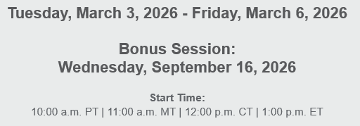 When: March 3-6, 2026 (12:00 to 3:00p.m. central time on March 3, 4, 5 and 12:00 to 2:00p.m. CT on March 6) and September 16, 2026 (12:00 to 2:00p.m.). This course will be presented virtually, so you can attend from the comfort of any place you wish.